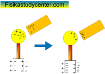 Muatan negatif dari benda akan tolak menolak dengan muatan negatif dari kepala elektroskop, sehingga muatan negatif di kepala elektroskop kemudian menjauh jalan-jalan ke bawah /kaki.